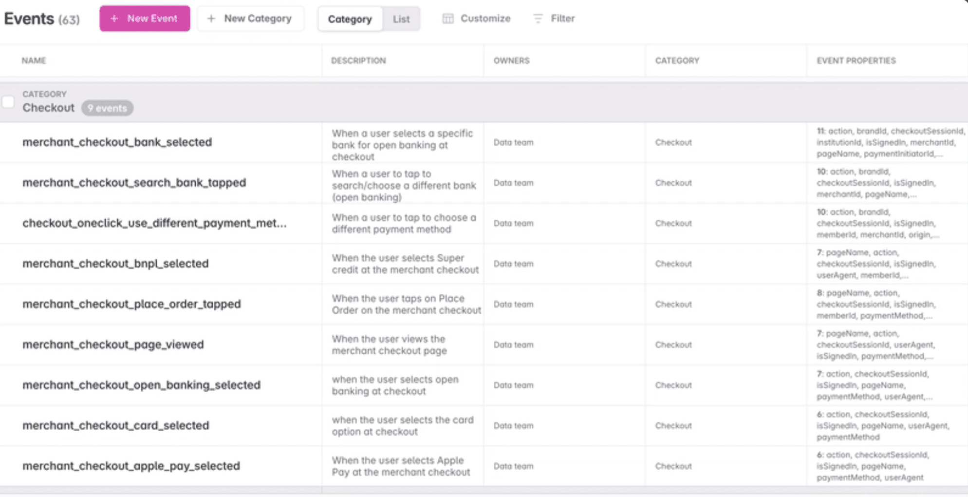 We are also in the process of migrating our legacy frontend tracking documentation. Around 80% of event definitions related to frontend checkout and Webflow (including Super Credit) have been moved from Google Sheets to Avo. The next step is to complete the migration for app-related frontend events.