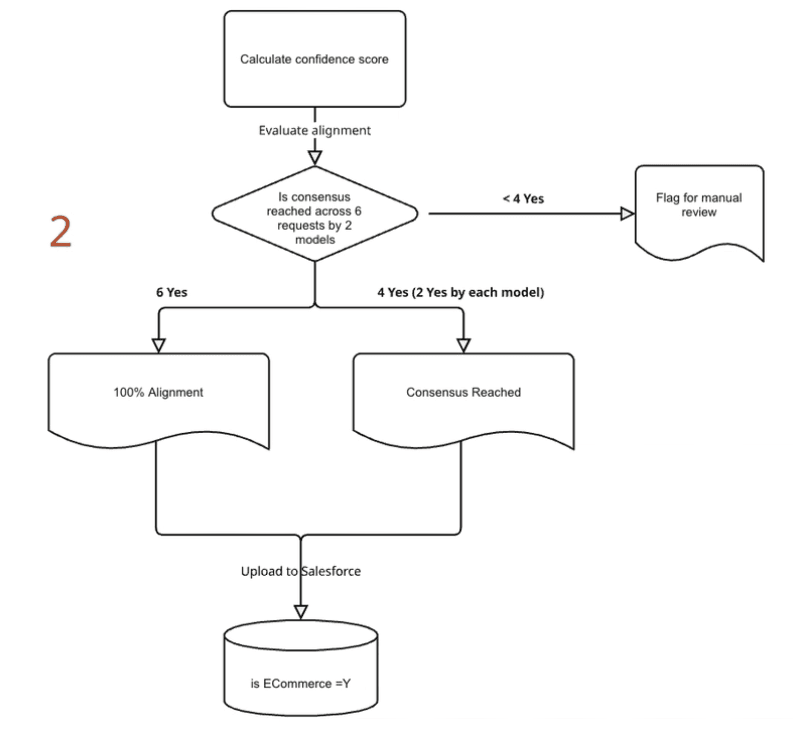 Accuracy Through Consensus: The core of our strategy is built on consensus. An ecommerce qualification is only confirmed if both LLMs independently agree. This simple but powerful rule acts as a powerful filter, significantly reducing the risk of a single LLM making a mistake, hallucinating, or misinterpreting a site.Mitigating Model-Specific Weaknesses: Every LLM has its own unique architecture, training data, and inherent biases. One LLM might be brilliant at identifying traditional retail sites but struggle with subscription services, while the other might have the opposite strengths. Using a single LLM means you also inherit all of its blind spots. By using two, we diversify our "cognitive portfolio," allowing the strengths of one LLM to compensate for the weaknesses of the other, leading to a more balanced and consistently accurate outcome.Automatic Quality Control: Perhaps the most valuable benefit is what happens when the LLMs disagree. A disagreement is a critical signal. It tells us that a website is ambiguous, an edge case, or complex in a way that could have easily fooled a single AI. Our system automatically flags these disagreements for manual review.