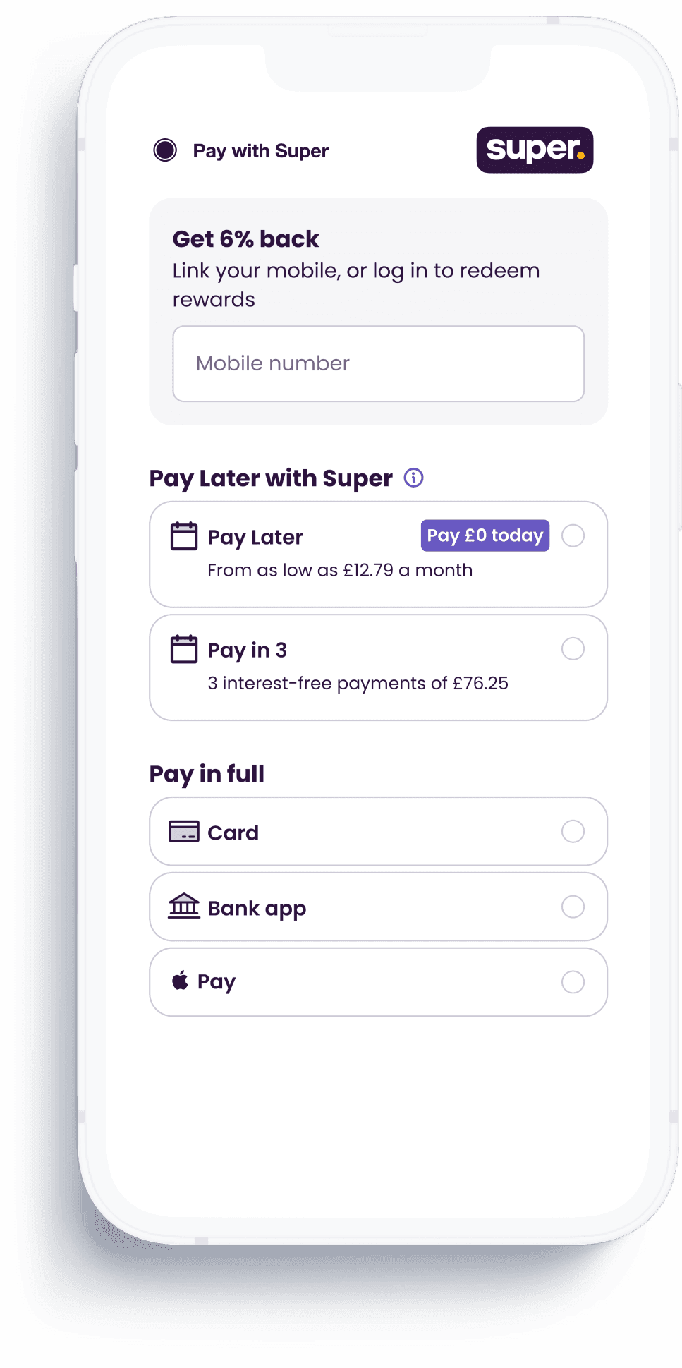 Super Credit is provided by Abound (see below) and is subject to status. Super is not a lender. Terms apply. Fintern Ltd, trading as Abound, is registered in England & Wales No. 12472034 and is authorised and regulated by the Financial Conduct Authority, FRN 929244. Fintern Ltd, 3rd Floor, 86-90 Paul Street, London, EC2A 4NE. Super Payments Limited, trading as Super and Super Payments, is an Introducer Appointed Representative (FRN 1034245) of Abound and may receive commission for introductions. Missed payments may affect your credit score.