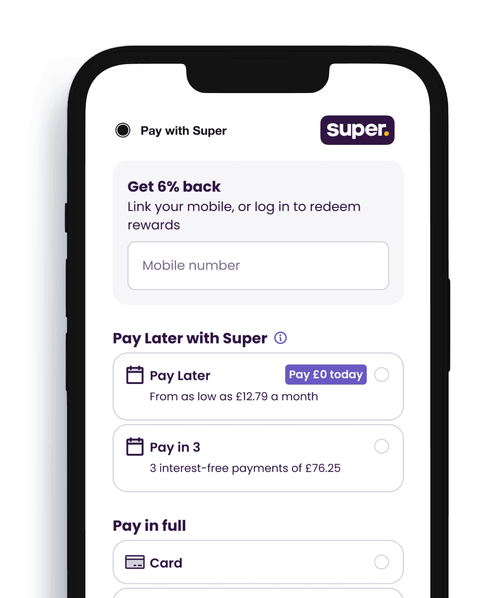 Super Credit is provided by Abound (see below) and is subject to status. Super is not a lender. Terms apply. Fintern Ltd, trading as Abound, is registered in England & Wales No. 12472034 and is authorised and regulated by the Financial Conduct Authority, FRN 929244. Fintern Ltd, 3rd Floor, 86-90 Paul Street, London, EC2A 4NE. Super Payments Limited, trading as Super and Super Payments, is an Introducer Appointed Representative (FRN 1034245) of Abound and may receive commission for introductions. Missed payments may affect your credit score.